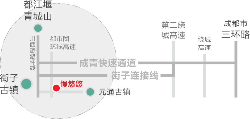 距街子古镇:约12分钟车程;距元通古镇:约7分钟车程;距青城山:约20分钟车程。